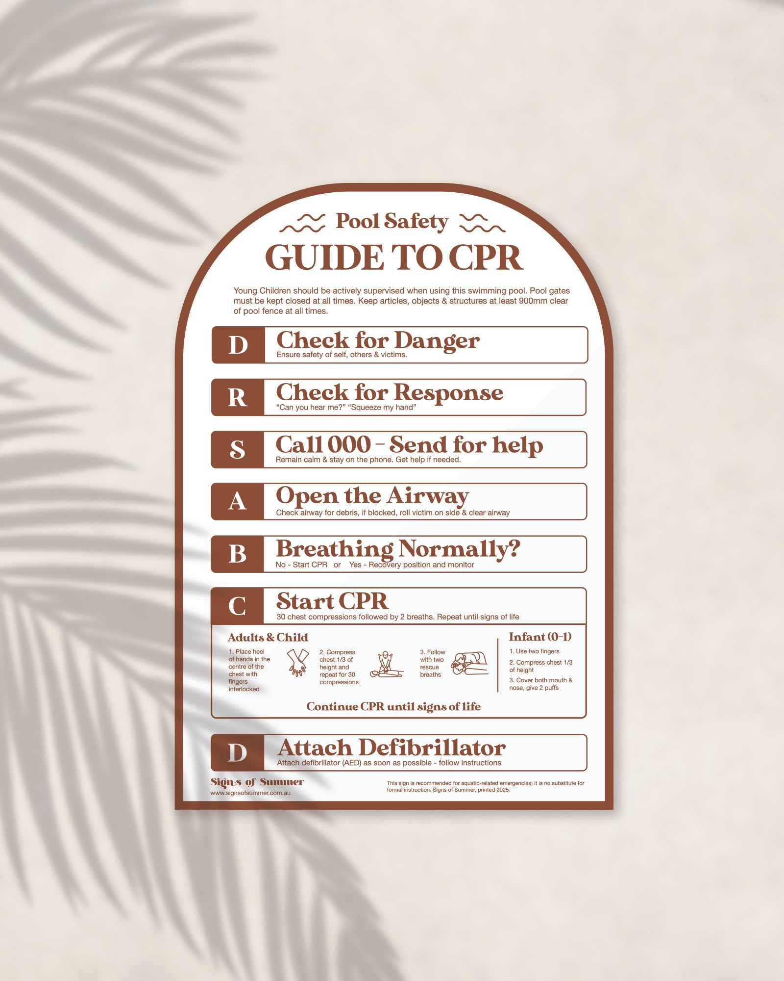 - Australian-Made Quality: Proudly designed, owned, and manufactured in Queensland, our CPR pool signs support local industry and guarantee superior craftsmanship. Each sign is meticulously crafted to meet the rigorous standards of the Australian market.