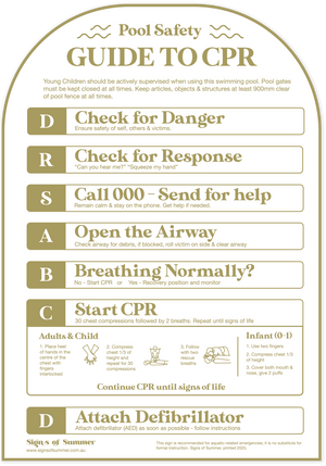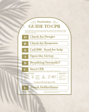 Ensure the safety of your pool area with our premium CPR pool sign, expertly designed and manufactured in Australia at our Gold Coast facility. Our CPR pool signs are built to withstand the harsh Australian sun, using commercial-grade aluminium composite panels and vinyl that guarantees over 3 years of reliable outdoor use.